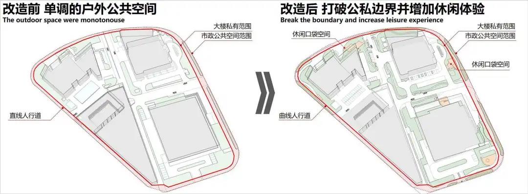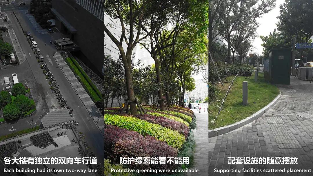 就設(shè)計(jì)本身來看問題,地塊內(nèi)的各個(gè)大廈起初是以建筑紅線為基準(zhǔn),建筑紅線范圍內(nèi)是屬于大廈物業(yè)各自管理的,因此三棟大廈在各自的地塊內(nèi)設(shè)置車行道、停車場(chǎng)及相關(guān)的配套設(shè)施如垃圾收集站等; 建筑紅線外的地塊范圍是屬于政府市政管理部門,因此這部分介于建筑與建筑之間的灰空間完全沒有使用價(jià)值,僅僅只是通行的功能。具體表現(xiàn)為: