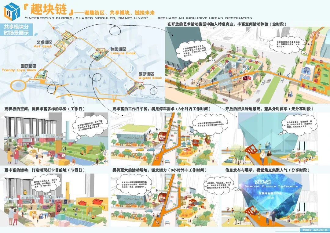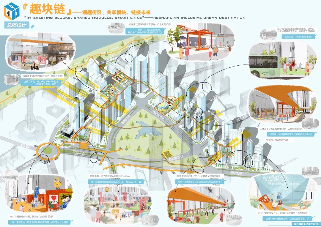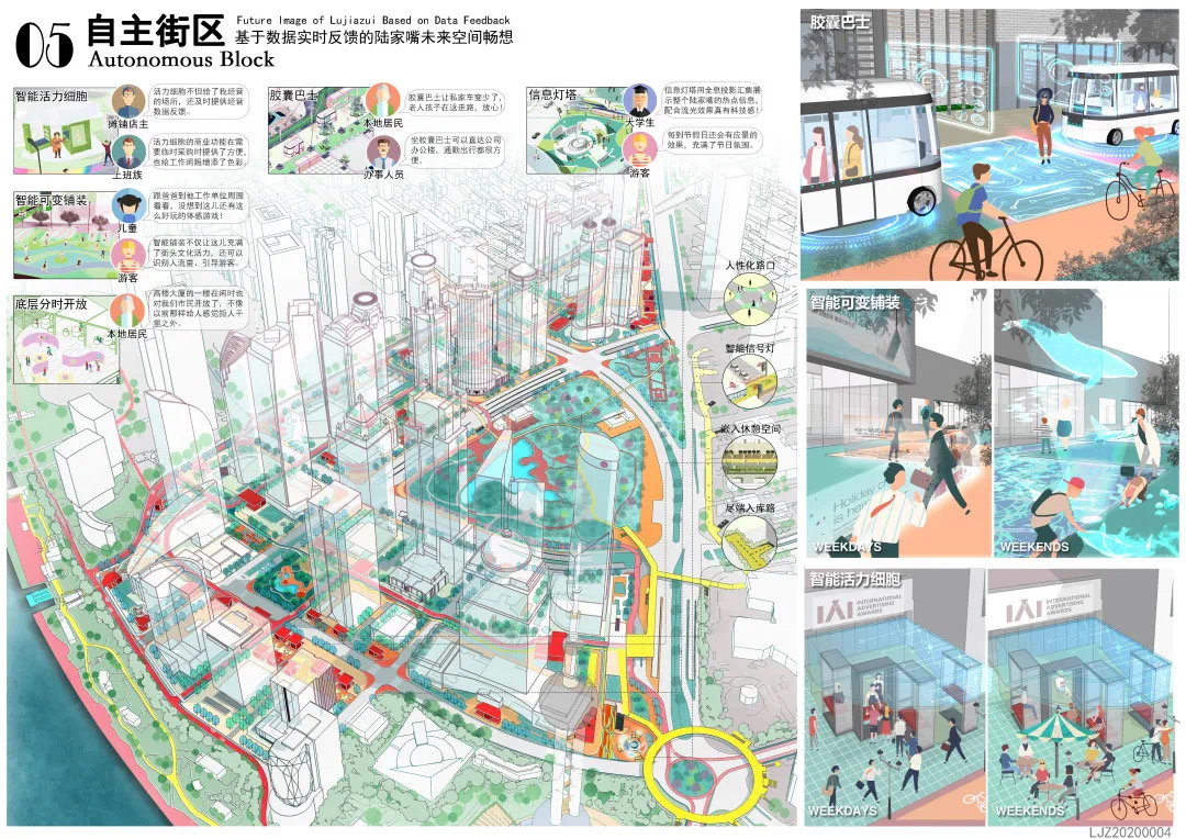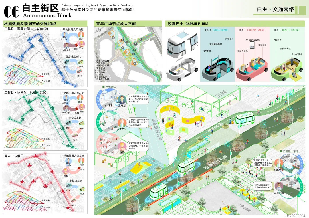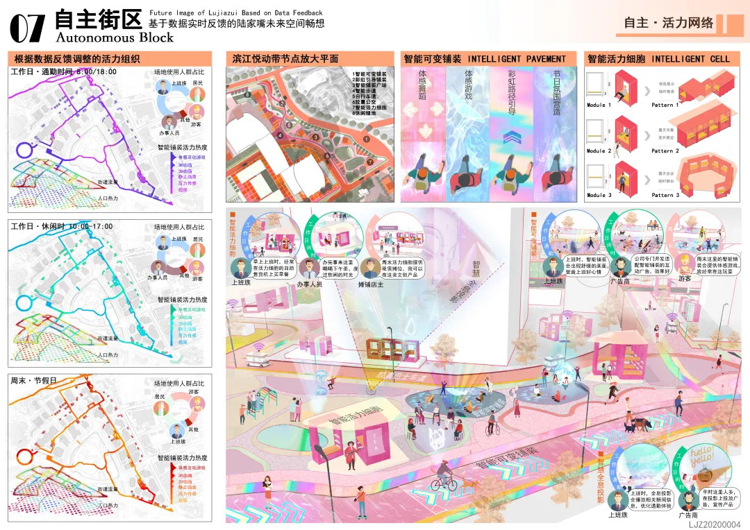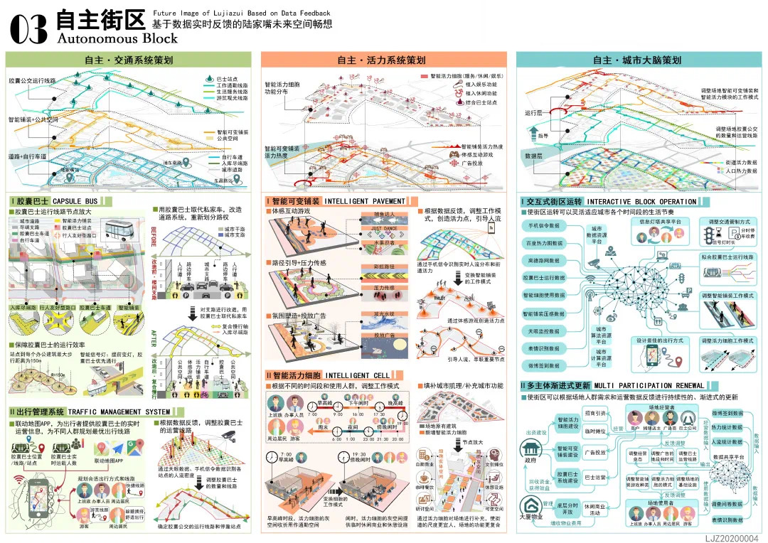 方案設計說明:本方案以基于數(shù)據(jù)實時反饋的自主街區(qū)為主題,通過構建自主交通、自主活力和自主城市大腦三大系統(tǒng),引入膠囊巴士、交通管理系統(tǒng)、智能可變鋪裝、智能活力細胞、底層分時開放、城市大腦和信息共享平臺,以提升該地區(qū)的空間活力;系統(tǒng)的運轉基于場地的時空需求進行實時調(diào)整,進行可持續(xù)的漸進式更新。