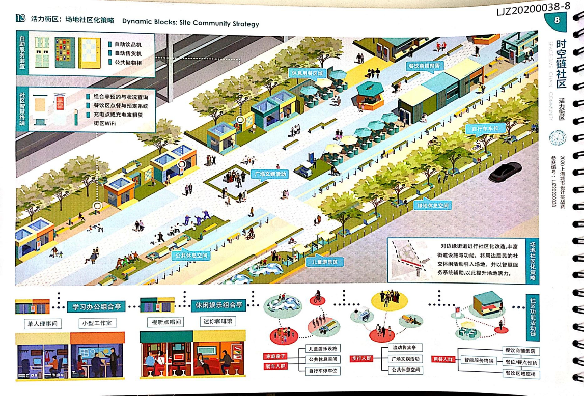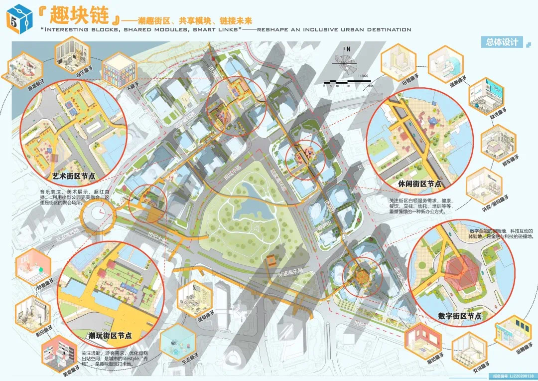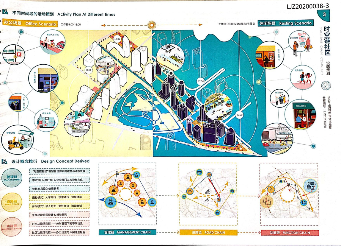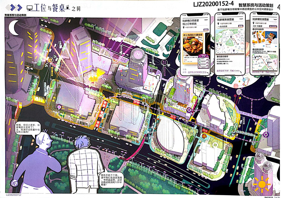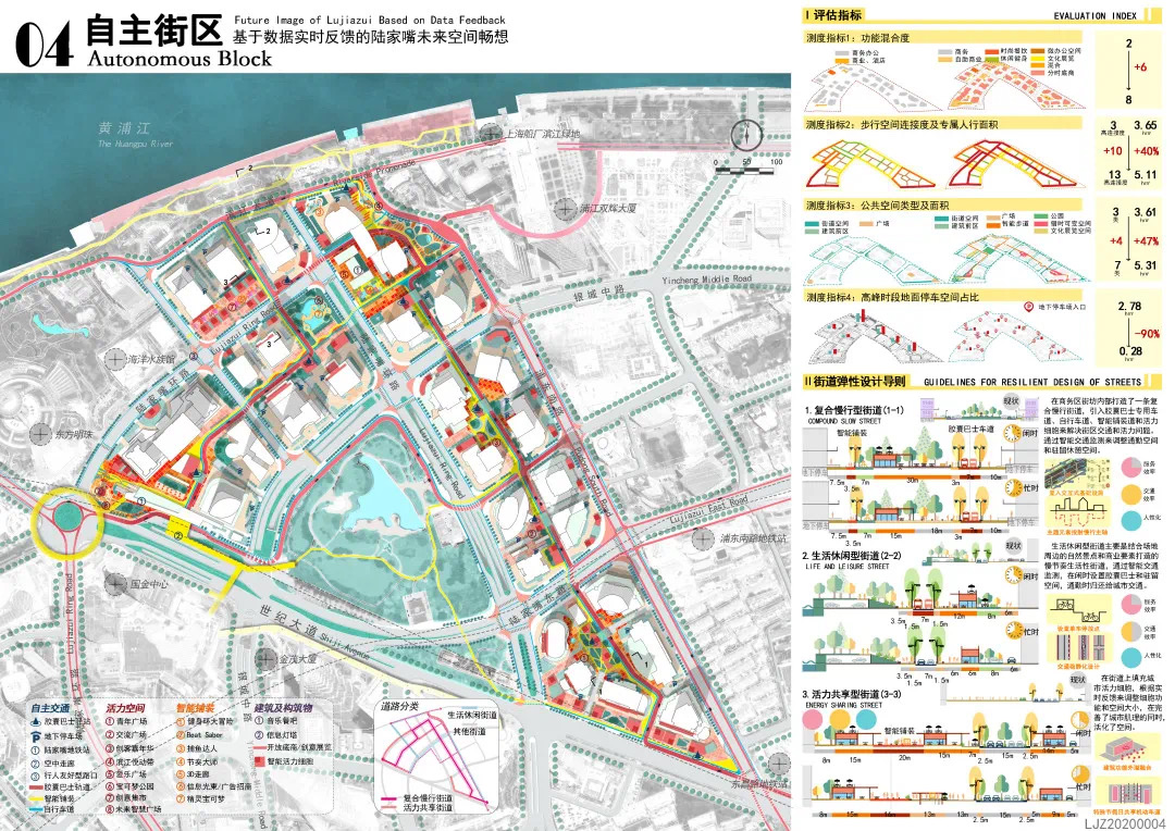 方案設計說明:本方案以基于數(shù)據(jù)實時反饋的自主街區(qū)為主題,通過構建自主交通、自主活力和自主城市大腦三大系統(tǒng),引入膠囊巴士、交通管理系統(tǒng)、智能可變鋪裝、智能活力細胞、底層分時開放、城市大腦和信息共享平臺,以提升該地區(qū)的空間活力;系統(tǒng)的運轉基于場地的時空需求進行實時調(diào)整,進行可持續(xù)的漸進式更新。