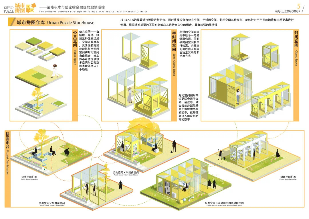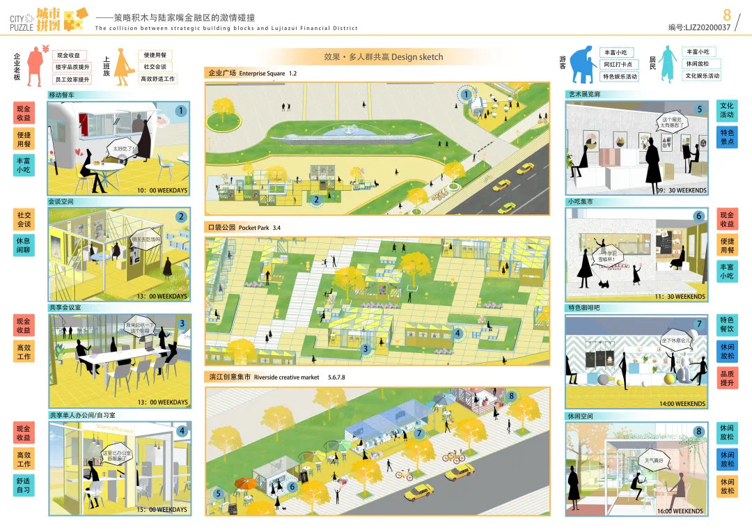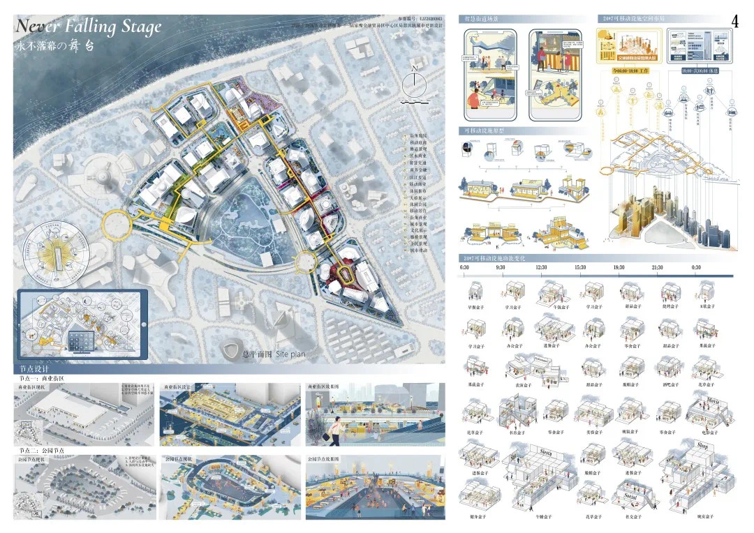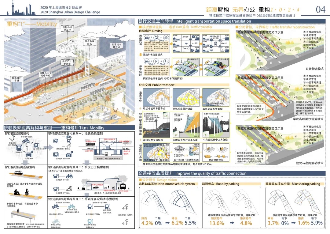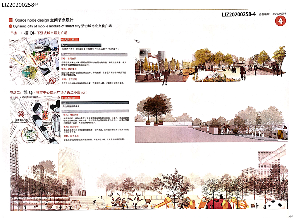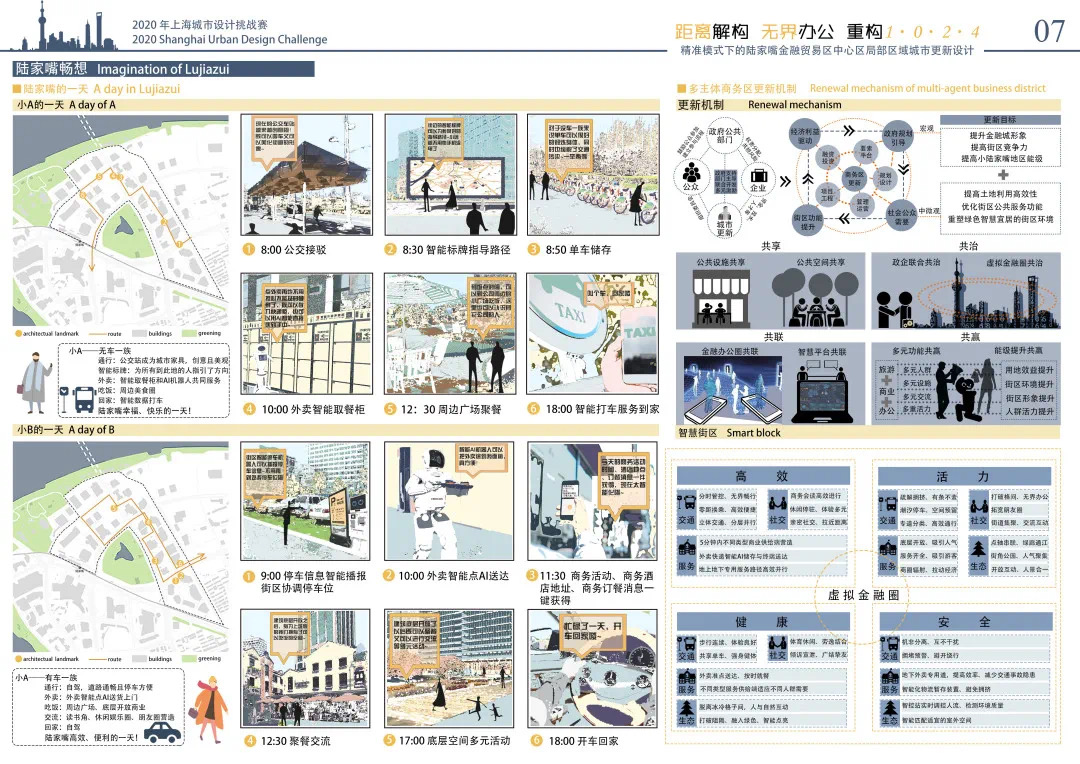方案設計說明:本方案以基于數(shù)據(jù)實時反饋的自主街區(qū)為主題,通過構建自主交通、自主活力和自主城市大腦三大系統(tǒng),引入膠囊巴士、交通管理系統(tǒng)、智能可變鋪裝、智能活力細胞、底層分時開放、城市大腦和信息共享平臺,以提升該地區(qū)的空間活力;系統(tǒng)的運轉基于場地的時空需求進行實時調(diào)整,進行可持續(xù)的漸進式更新。