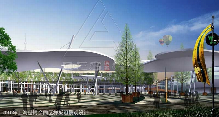 整體環(huán)境景觀上運(yùn)用道家“太極”的形和神,讓植物等軟質(zhì)景觀包容廣場(chǎng)、展會(huì)建筑、高架步道、市政設(shè)施等硬質(zhì)景觀,彼此間相互協(xié)調(diào),形成“和諧共生”的統(tǒng)一體。另外,根據(jù)世博園的空間結(jié)構(gòu)及生態(tài)肌理,構(gòu)思利用可移動(dòng)綠化等設(shè)施組成“綠廊”,簡(jiǎn)潔有序地組織交通并軟化空間環(huán)境,最終形成“有機(jī)組團(tuán)整體”。 “綠廊”的應(yīng)用給具有理性美的場(chǎng)館空間帶來了活力。建筑只是綠色基底上零星灑落的斑塊,而“綠廊”是連接各場(chǎng)館的綠色廊道。它們起到了“隔、融、透、廊、屏”的作用,實(shí)現(xiàn)了極具東方特色的空間體驗(yàn)。在出入口廣場(chǎng)區(qū)域設(shè)計(jì)中采用 “太極”的流線形式來分隔內(nèi)外廣場(chǎng),它與直線形式相比增大了出入口區(qū)域長度,最大化實(shí)現(xiàn)人流與出入口接觸面,同時(shí)流線形鋪裝帶有引導(dǎo)標(biāo)識(shí),能明晰順暢的組織交通。樣板組團(tuán)是否成功十分關(guān)鍵,它將拉開世博“和諧城市”的建設(shè)序幕。