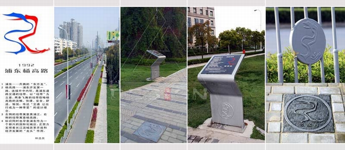 林選泉:嗯,是的。同樣的小設(shè)計(jì)我這還有一個(gè)例子,是浦東開發(fā)開放第一路--楊高路標(biāo)識(shí)的創(chuàng)立與運(yùn)用。它是楊高路改造景觀系統(tǒng)中的一個(gè)小部分,整體景觀改造上我認(rèn)為不能僅僅關(guān)心速度,而是整個(gè)交通空間環(huán)境質(zhì)量的改善,努力實(shí)現(xiàn)“交通·讓出行成為一種享受” 這一美好愿望。為了增強(qiáng)楊高路道路文化內(nèi)涵,我策劃設(shè)計(jì)了“升騰的東方龍”等一系列LOGO,并通過公眾參與方式投票確立最終方案,將其運(yùn)用到道路隔離欄、人行道鋪裝等附屬設(shè)施中,并在人流大的重要節(jié)點(diǎn)設(shè)立“標(biāo)識(shí)創(chuàng)意說明”。這一系列做法目的是想讓大眾解讀楊高路道路文化內(nèi)涵,在詮釋中加深道路文化的認(rèn)同。提升楊高路形象。我記得當(dāng)時(shí)有媒體稱“道路也可以像商品一樣擁有自己的商標(biāo),這在上海屬首次”。這種做法也影響了后來浦東其它改造和新建的道路。