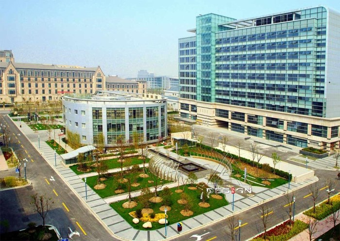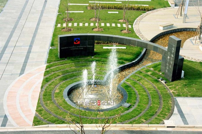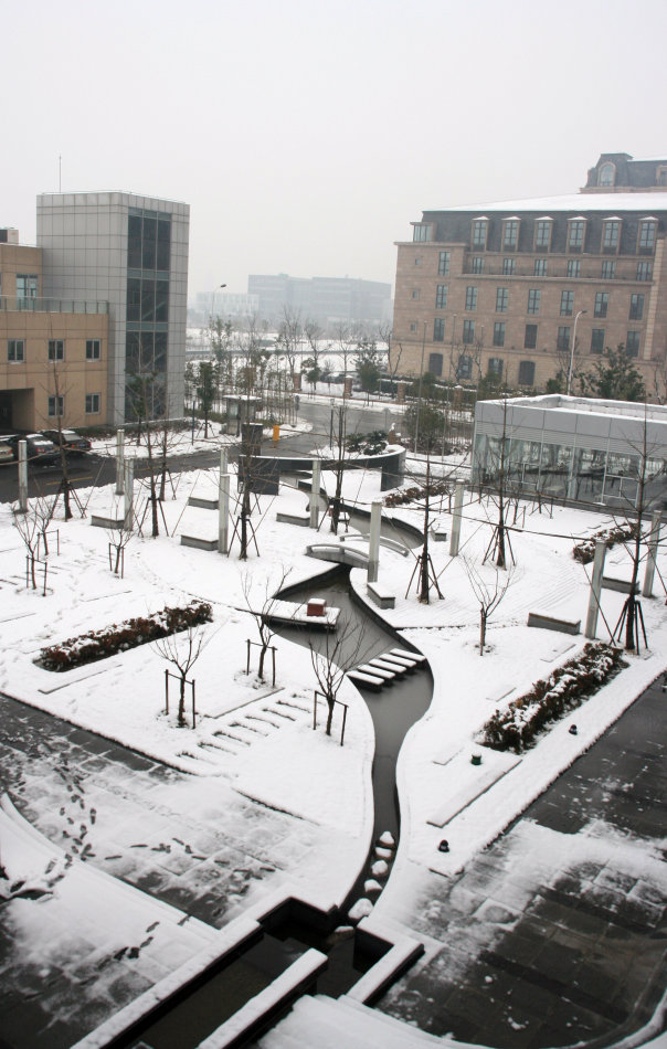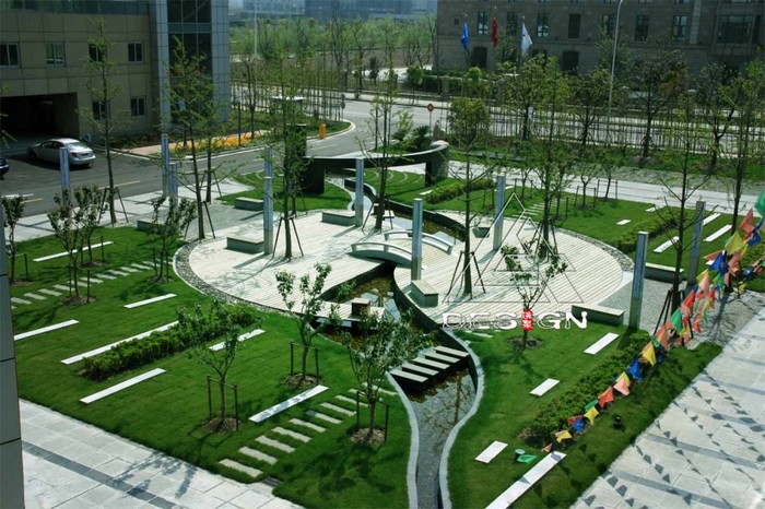 The project carried out formerly is a first-stage comprehensive matched service base which faces roads externally. An L-shaped main office building divides the space into an eastern part and a western part; the main entrance landscape space in the east and the roof garden landscape space of the underground garage in the west. For ensuring the integrity of the space, space is related by continuous water with variable forms and black and white pavements, while small spaces are alternated in the space by the landscape elements, such as plants, micro-landforms and small arch bridges, curves and a circular composition method to create order and activity within the environment.