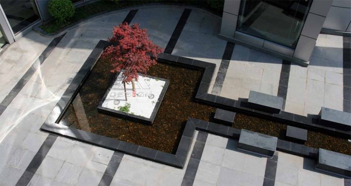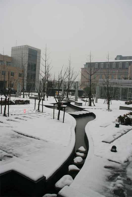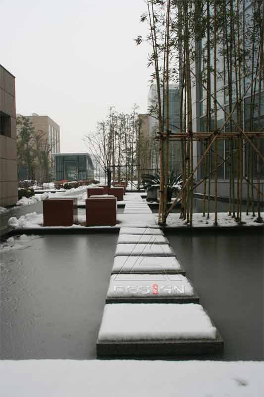 該項目在有限的空間環(huán)境中通過各種造園手法——入口成排的剛竹、弧形的景墻、蜿蜒的小溪、筆直的水槽、錯落的跌水、精致的小橋、方圓組合的綠地與休閑平臺等,形成了既有開放的動空間,又有內(nèi)聚的靜空間,使整體環(huán)境在融入周圍現(xiàn)代建筑的同時又有傳統(tǒng)的意境之美。
