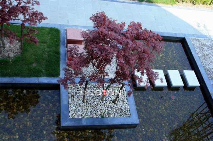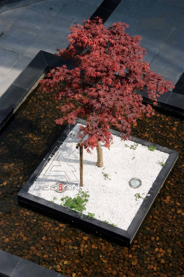 白卵石上的竹子與紅楓浸透著幾分寧靜與典雅;涉水而建的石汀步以及向水中延伸的種植池、休憩平臺及其上面的紅色方凳豐富了小空間的多樣性,人們坐在辦公室的窗邊,獨享這午后的寧靜。微風(fēng)穿過竹林,拂起卵石邊的水波,因為水,空間變得“隔”而不分; 窗外行走,交談的聲音變得若即若離,水里的魚兒在自由游弋,這里此刻多了幾分自然情趣。