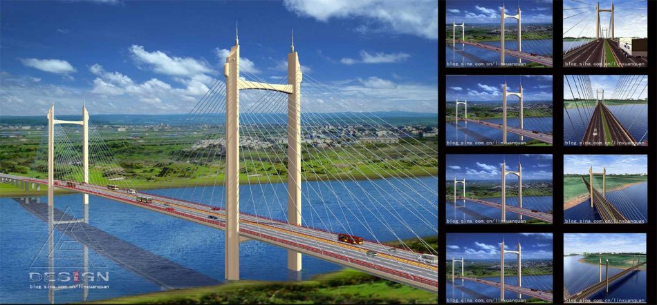 斜拉橋其剛度大、空氣動(dòng)力性能好,且簡(jiǎn)捷流暢、連續(xù)舒展、輕巧纖細(xì)、、向上動(dòng)勢(shì)感強(qiáng),體現(xiàn)橋梁的現(xiàn)代美。它與懸索橋同屬懸吊式結(jié)構(gòu),在景觀特征上有共同之處,與其他橋型相比,都增加了塔和索的構(gòu)造,在空間構(gòu)圖上對(duì)單維突出的水平大梁起到了協(xié)調(diào)比例的作用。斜拉橋橋型景觀主要是以豎直線的橋塔、斜直線的拉索、拱曲線的主梁等為主基調(diào),斜拉橋的橋體景觀印象中,是以剛性的美為審美主格調(diào)。斜拉橋的橋塔、主梁、拉索、橋墩等橋梁主體結(jié)構(gòu)構(gòu)件的景觀設(shè)計(jì)是橋梁(總體)景觀設(shè)計(jì)的重要組成部分,影響著橋梁整體風(fēng)格和形象。