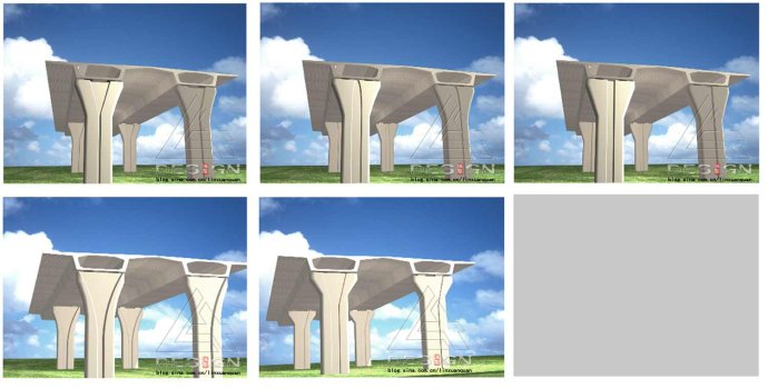 松花江大橋引橋橋墩材料以混凝土為主材料,具有可塑性,其形態(tài)設(shè)計(jì)自由度大。在原設(shè)計(jì)的帶凹槽Y形橋墩的造型基礎(chǔ)上, 考慮了橋墩立體形態(tài)的虛實(shí)、剛?cè)帷纪辜肮庥白兓\(yùn)用計(jì)算機(jī)“虛擬真實(shí)”技術(shù)引申設(shè)計(jì)出了一系列Y形橋墩。(圖10 為松花江大橋橋墩造型景觀設(shè)計(jì)部分方案)