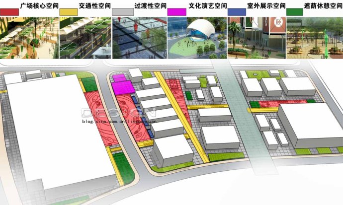 2)在合理有序的落實大量配套設施的同時,也要滿足為展館提供室外展示、小型演出、游人的休閑活動、排隊等候以及人流疏散等空間功能需求;