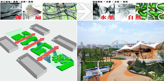 人流可以短暫停留與休息的楔形綠地則通過“水墨,自然”的概念,呼應濱江綠地的“灘”和“扇”,形成“曲”中有直的空間。功能上,“曲”的綠地利于營造富于變化、以小見大的空間且滿足人的駐足停留。直的“植物通廊”既保證風道和視線的通透、同時又能利于疏散東西向的展館之間人流。同時在植物空間上采用喬木加耐踐踏草坪的模式,沒有地形,保證人流通行(如圖10)。