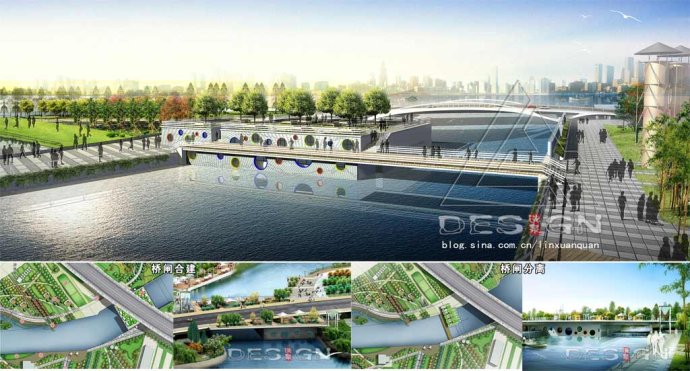lying door ; the exterior surface of the pump station can be ornamented with circular abstract pattern, which diminish dull and bulky of the concrete; the top of the pump and floodgate mixed with green plants can be accessible to visitors and used as sightseeing platform; detection bridge of the pump-gate can be designed as a pedestrian bridge connecting the two sides of the Bailian Jing River. What to be addressed here is that through the integration of technology and art, the pump -gate can be harmonious with neighboring environment to the maximum extent, and also serves as one scenic spot amongst all the waterfront landscapes.