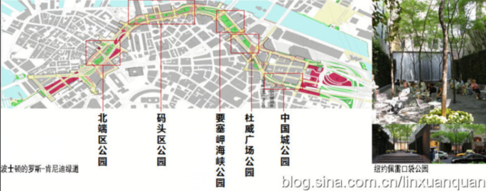 ??? 該設(shè)計靈感來源于現(xiàn)實的兩個案例,一個是美國波士頓的羅斯-肯尼迪綠道,該綠道是美國“大開挖”的產(chǎn)物,將穿過波士頓市中心的高架中央大道拆除,引入到地下隧道后,在原來的地面空地上建成了一條貫穿南部碼頭區(qū)和北區(qū)盡頭的綠色綠道,將這些分割的帶狀空間通過林蔭大道串聯(lián)起節(jié)點公園。同時,借鑒了美國紐約市的口袋公園體系的做法,在高密度發(fā)展的城市中心,通過尺度宜人的小公園系統(tǒng)來彌補城市綠地臨近性差的問題。
