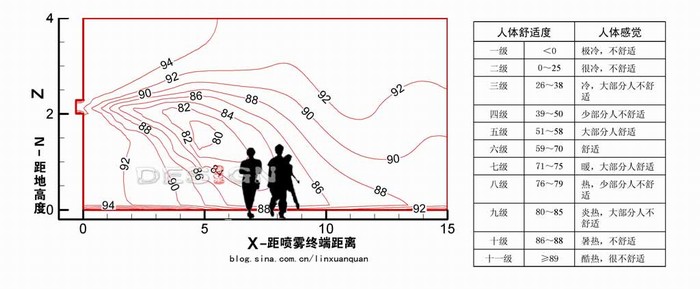 采用低壓可移動(dòng)式噴霧降溫設(shè)備,當(dāng)行走的成年人群以0.9-1.4m/s 的平均步速行進(jìn),可以感受到步行引導(dǎo)區(qū)內(nèi)1~8m/s的人工風(fēng)速,水霧蒸發(fā)吸熱降低局部環(huán)境溫度3-5°,裸露皮膚的平均液體沉降<5ml/min,100米引導(dǎo)區(qū)行走獲得的液體量<6ml,并迅速蒸發(fā),沒(méi)有增加濕度,不會(huì)產(chǎn)生不適感。