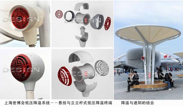 ?? 噴霧降溫終端設(shè)計(jì)以“圓融”為理念,采用簡(jiǎn)潔的球體和柱體來(lái)演繹。出風(fēng)口裝飾紋樣采用距今四千多年前仰韶文化馬廠遺址中的陶器上的“回字體紋樣”:立桿式降溫終端采用“傳統(tǒng)四連回紋樣”,懸掛式降溫終端采用“傳統(tǒng)圓形回紋窗紋樣”。降溫終端色彩主體上采用白色,僅在出風(fēng)口的紋樣部位飾以“中國(guó)紅”,與中國(guó)館形成呼應(yīng)。通過(guò)符號(hào)、色彩、形體的對(duì)比整體上達(dá)到“傳統(tǒng)與現(xiàn)代的統(tǒng)一”。(如圖9)